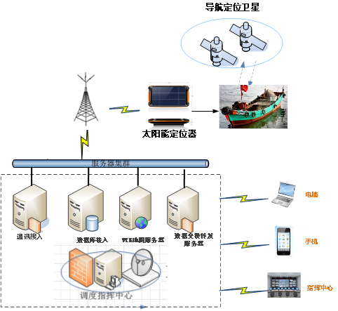 该方案利用船用定位器 /船用短报文定位器/渔船 北斗 定位器的北斗/GPS 双模定位、通过4G/RDSS进行数据通信、专有云服务、大数据、卫星通信技术相结合,实时、在线监控船舶的实时动态相关信息,并通过运营商4G网络将船舶位置信息、轨迹、设备电量情况、SOS报警、船舶倾覆程度、设备是否被拆卸、船舶越界状态等数据回传至后台服务器,服务器收到回传数据后在WEB端平台和手机端平台进行展示,让管理机构和使用者实现随时随地监管 的目标。